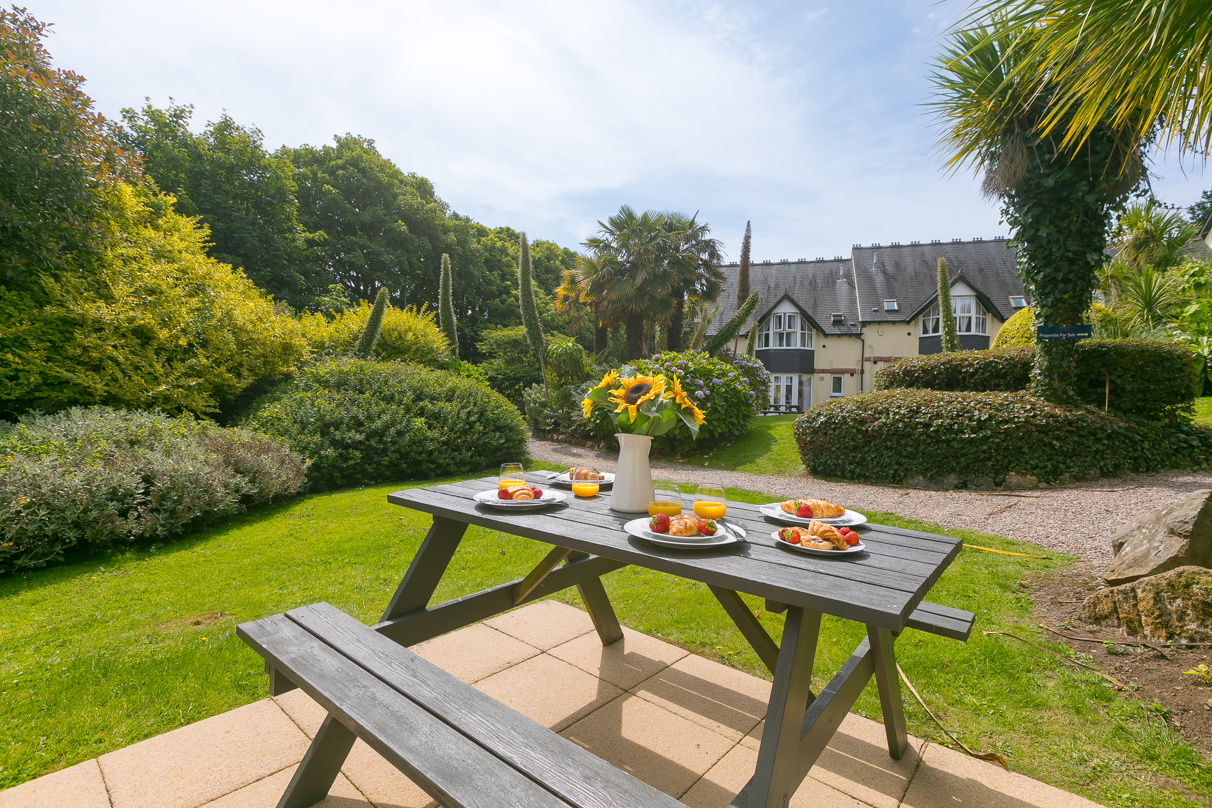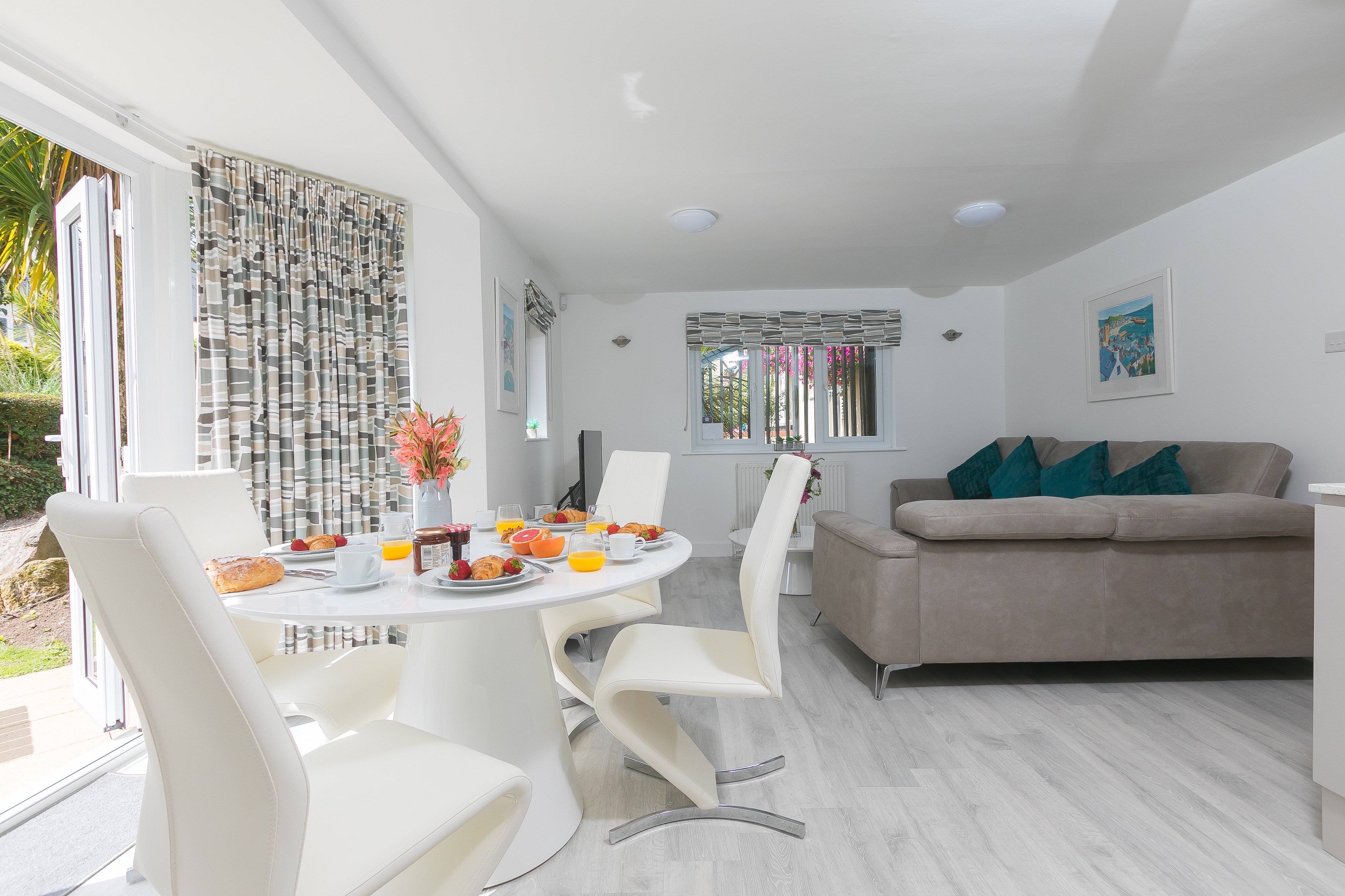 The dining area includes a stylish round table with seating for four, with double doors opening directly onto the patio and gardens, creating a lovely indoor–outdoor flow. Outside, you’ll find a six-seater wooden picnic bench overlooking the gardens, complete with palm trees that reflect St Ives’ unique subtropical climate.