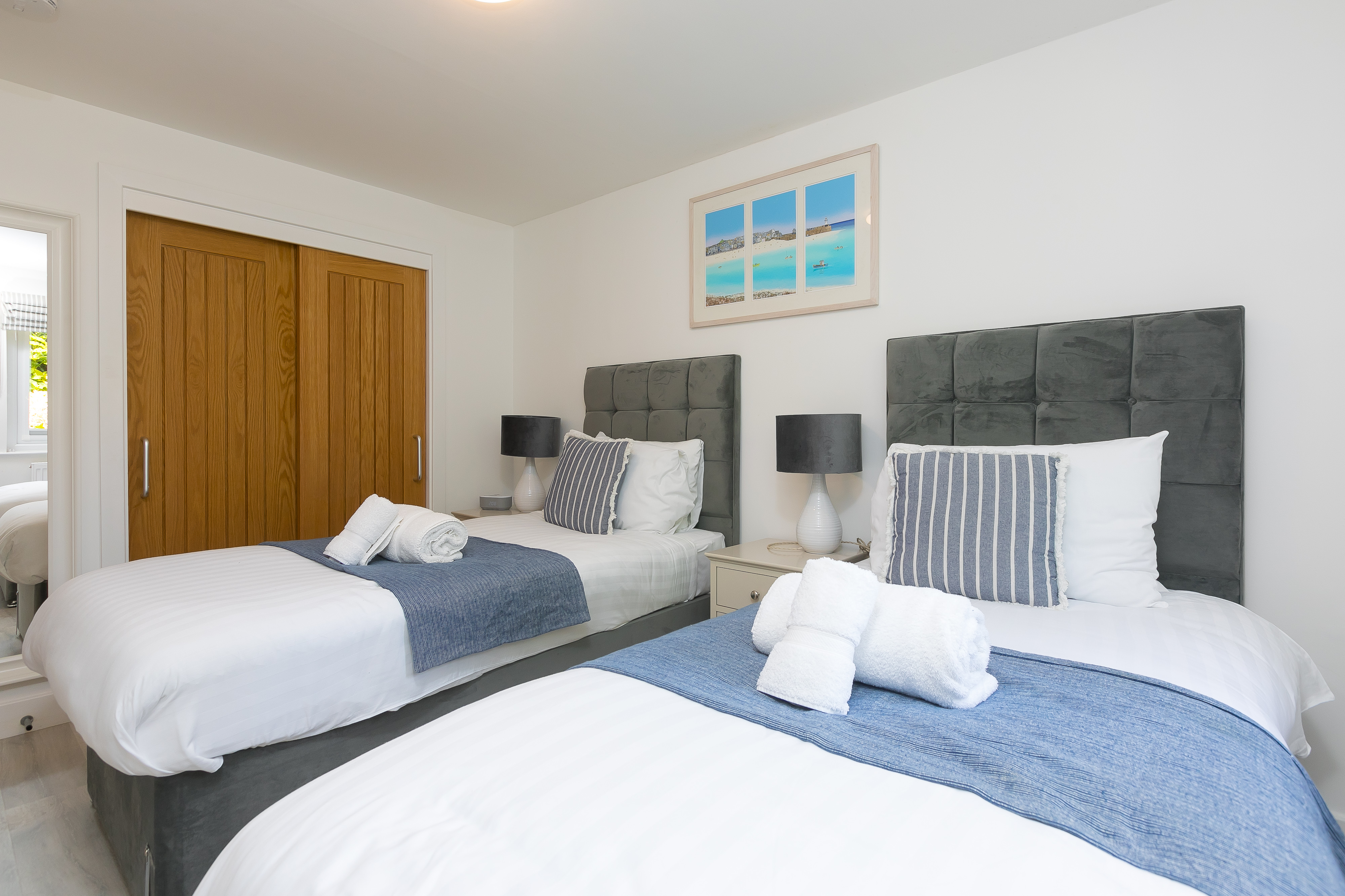 Lamorna offers two beautifully appointed bedrooms, each featuring zip-and-link beds that can be arranged as either twin singles or a luxurious super-king, giving flexibility for couples, friends or families. Both bedrooms include large wardrobes, bedside tables with alarm clocks and charging points, and USB sockets for added convenience. In the master bedroom wardrobe, you’ll find an iron, ironing board and small safe, while a hairdryer is provided in the bedside table. As St Ives can enjoy warm summer days, each bedroom is also equipped with its own fan for extra comfort.